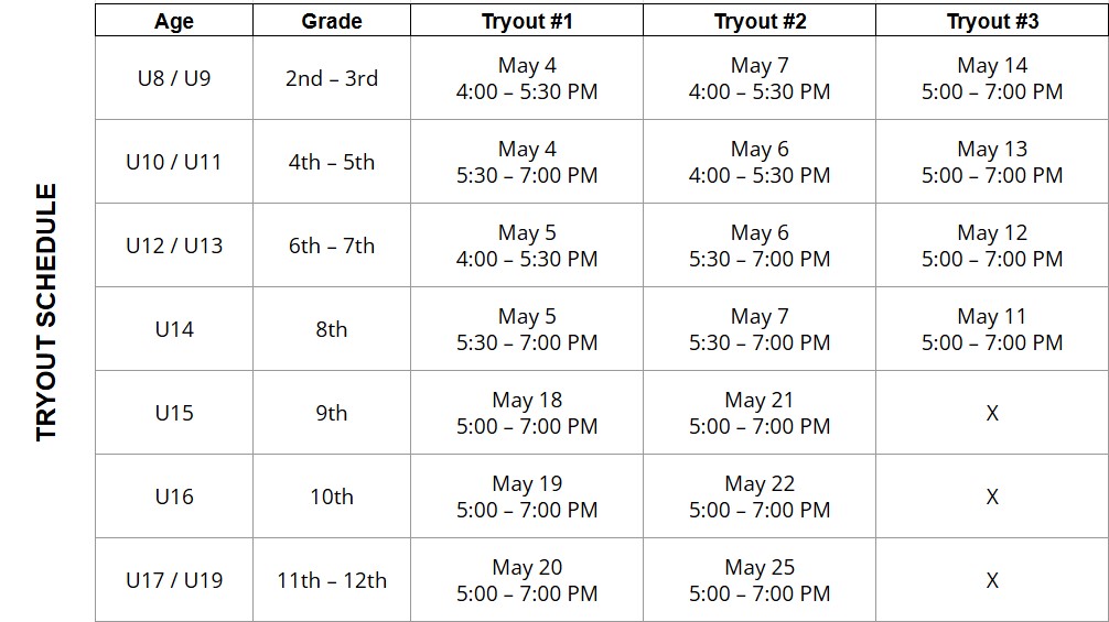 Missed the May window? We are always looking for committed, talented players. If you are looking to be evaluated mid-season or have recently moved to the area, please contact our Competitive Program Director at [email protected] to schedule an individual evaluation.