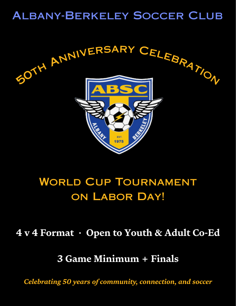 The ABSC ‘World Cup’ event is a one-day soccer celebration and a great way to kick-off your fall soccer season! It is also ABSC's main fundraiser for our Scholarship Fund. Help us provide an opportunity for all kids, regardless of finances, to play soccer. The format is 4v4 on small fields. Each team is guaranteed 3 games with a possible final. While the format is a competition, the attitude is a love for the game.